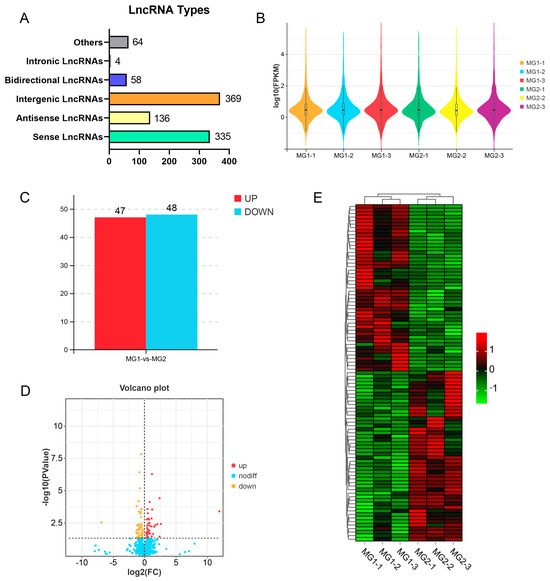 Identification and analysis of lncRNAs in goat ovary. (A) Type statistics of identified lncRNAs. (B) The six sample expressions in a violin plot, which was replaced by log10(FPKM). (C) Numbers of up-regulated and down-regulated lncRNAs. (D) Volcano plots showing the up-regulated and down-regulated lncRNAs in MG1 vs. MG2. (E) Hierarchical clustering analysis of DElncRNAs. Red: relatively high expression; green: relatively low expression.