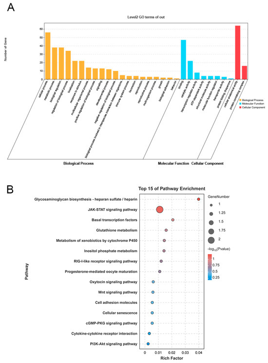 KEGG enrichment analysis further revealed that the target genes of DElncRNAs were associated with the JAK-STAT, Wnt, and PI3K-Akt signaling pathways, in addition to progesterone-mediated oocyte maturation and cytokine–cytokine receptor interaction, all of which are pivotal in ovarian development, follicle activation, and the regulation of the reproductive cycle. The JAK-STAT signaling pathway plays a crucial role in preserving primordial follicle reserves [39]. Furthermore, JAK signaling is instrumental in the formation of primitive follicles in mice and is involved in the proliferation of granulosa cells; its inhibition, particularly via JAK3, leads to a reduction in granulocyte proliferation. Inhibition of JAK3 expression may also result in impaired formation of primordial follicles [40]. Research indicates that the Wnt signaling pathway is essential for the regulation of normal mammalian reproductive system development. This pathway is primarily involved in the formation of the Müllerian duct, regulation of follicular development, ovulation, luteinization, and the establishment of normal pregnancy [41,42,43,44]. During ovarian development, the Wnt/β-catenin pathway regulates granulosa cell proliferation, differentiation, and apoptotic activity, which are directly linked to follicular development and atresia [45,46,47]. Additionally, the PI3K-Akt signaling pathway is significant in follicular development and facilitates the interaction between oocytes and surrounding cumulus cells [48]. Therefore, the DElncRNAs enriched in reproduction-related pathways plays a crucial role in ovarian development and sexual maturation in Meigu goats.