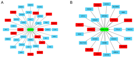 The lncRNA–mRNA interaction networks. (A) LncRNA–mRNA networks for MSTRG.15110.2. (B) LncRNA–mRNA networks for MSTRG.15120.9. Green represents lncRNAs, red represents the cis-acting interaction, and blue represents the trans-acting interaction. The networks were visualized using Cytoscape (V3.9.1) software, accessed on 20 September 2023.