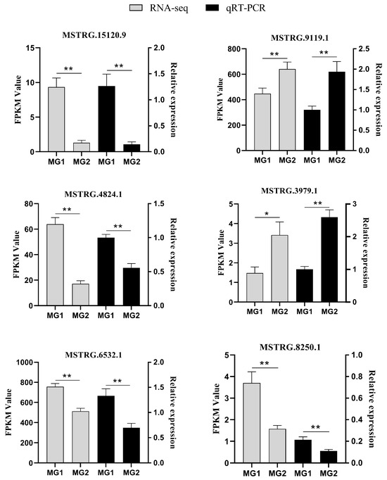 To further validate the reliability of the RNA-seq data, six DElncRNAs (MSTRG.15120.9, MSTRG.3979.1, MSTRG.4824.1, MSTRG.8250.1, MSTRG.9119.1, and MSTRG.6532.1) were randomly selected for expression level measurement via quantitative reverse transcription PCR (qRT-PCR). The qRT-PCR results corroborated the expression patterns observed in the RNA-seq data (Figure 5), thereby confirming the accuracy and reliability of the sequencing data.