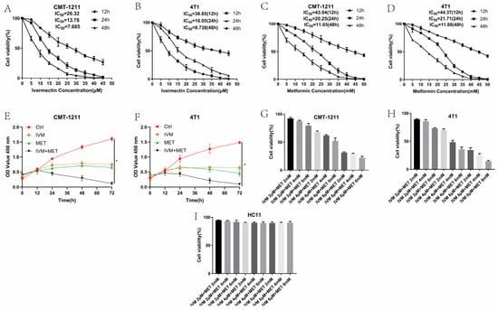 Cytotoxic effects of IVM, MET, and their combination on CMT-1211 and 4T1 cells. (A,B) CCK-8 assay detected CMT-1211 and 4T1 cell viability at 12 h, 24 h, and 48 h after IVM treatment. (C,D) CCK-8 assay detected CMT-1211 and 4T1 cell viability at 12 h, 24 h, and 48 h after MET treatment. (E,F) CCK-8 was used to evaluate the activity of CMT-1211 and 4T1 cells after 0 h, 12 h, 24 h, 36 h, 48 h, 60 h, and 72 h in different treatment groups. (G,H) IVM of 2 μM, 4 μM, and 6 μM were combined with MET of 2 mM, 4 mM, and 6 mM, respectively. CCK-8 method was used to evaluate the cell viability of CMT-1211 and 4T1 after treatment with different drug groups. (I) Cell viability of HC11 control cells.