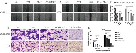 The effects of IVM combined with MET on the migration and invasion of breast cancer cells. (A–C) Wound healing test was used to measure the migration capacity of tumor cells for 24 h on A scale of 1000 µm. (D,E) The invasive ability of CMT-1211 and 4T1 cells treated with different treatment groups for 24 h was determined using Transwell chambers precoated with matrix gel. Scale: 100 µm. ** p < 0.001, *** p < 0.0001, **** p < 0.00001.