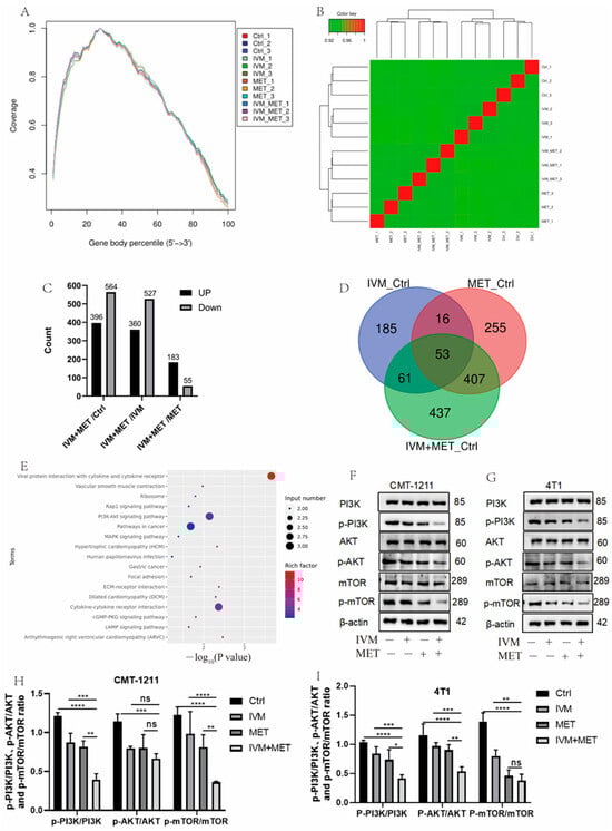 Analysis of transcriptome results. (A) The uniform distribution curve of the reads on the reference genome. (B) Hierarchical clustering diagram of gene expression levels in samples. (C) Differentially expressed genes were screened by IVM+MET/Ctrl group, IVM+MET/IVM group, IVM+MET/MET group. (D) Venn diagram of differentially expressed genes. (E) KEGG enrichment pathway. (F–I) Western blotting was used to analyze the expression levels of different groups of PI3K, p-PI3K, AKT, p-AKT, mTOR, and p-mTOR in CMT-1211 and 4T1 cells. All the experiment results are the mean ± standard deviation of three independent experiments. * p < 0.05; ** p < 0.001; *** p < 0.0001; **** p < 0.00001; ns = not significant.
