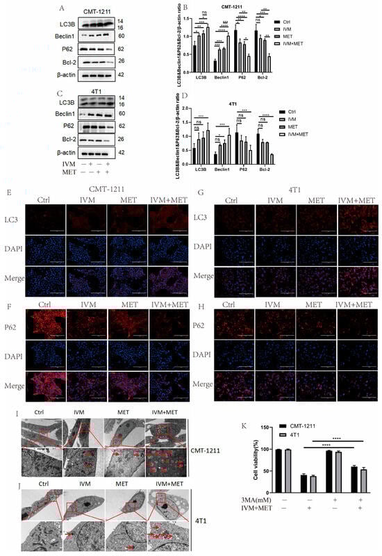 Most of the studies have shown that drug-induced autophagy is essential in anticancer therapy [21]. Aberrant autophagy is also an important mechanism of drug resistance in tumors. Therefore, based on transcriptomic analysis, this study examined the regulation of IVM combined with MET on autophagy. Western blot results showed that the protein expression levels of LC3B and Beclin1 in the IVM+MET group were significantly increased. In contrast, the expression levels of P62 and Bcl-2 were significantly decreased (Figure 4A–D). The immunofluorescence results of LC3B and P62 were consistent with the Western blot results (Figure 4E–H). These results indicated that the combination of the two drugs was involved in regulating the autophagy process of breast cancer cells and inducing the occurrence of excessive autophagy. In addition, we observed by TEM that the autophagosome/autophagolysosome accumulation was more significant in the IVM combined MET group than in the control cells of the four treatment groups (Figure 4I–J). At the same time, we pretreated CMT-1211 and 4T1 cells with autophagy blocker 3-MA for 2 h and then pretreated cells with the combined treatment group for 24 h, detected the cell viability, and found that the cell viability of the 3-MA pretreated group was significantly increased (Figure 4K). These data suggest that IVM combined with MET stimulates autophagy in breast tumor cells.