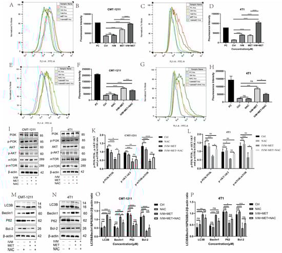 IVM + MET induces autophagy in CMT-1211 and 4T1 by promoting excessive ROS accumulation. (A,B) Flow cytometry was used to detect the ROS levels of CMT-1211 cells after different treatment groups. PC (Red),Ctrl (Dark Green),IVM (Light Green),MET (Light blue),IVM + MET (Orange).(C,D) Flow cytometry was used to detect the ROS levels of 4T1 cells after different treatment groups. PC (Red),Ctrl (Light Green), IVM (Orange), MET (Light Blue), IVM + MET (Dark Green). (E,F) After being treated with 0 mM, NAC (10 mM), IVM + MET, and IVM + MET + NAC, the ROS levels of CMT-1211 cells were detected by flow cytometry. PC (Light Green), Ctrl (Light Blue), NAC (Red), IVM + MET (Orang),IVM + MET + NAC (Dark Green). (G,H) After being treated with 0 mM, NAC (10 mM), IVM + MET, and IVM + MET + NAC, the ROS levels of 4T1 cells were detected by flow cytometry. PC (Dark green), Ctrl (Light Blue), NAC (Orange), IVM + MET (Light Green), IVM + MET + NAC (Red). (I–L) After 0 µM, NAC (10 mM), IVM+MET, IVM+MET+NAC, Western blotting was used to analyze the expression levels of PI3K, pPI3K, AKT, p-AKT, mTOR, and p-mTOR in CMT-1211 and 4T1 cells. (M–P) After 0 µM, NAC (10 mM), IVM+MET, IVM+MET+NAC, Western blotting was used to analyze the expression levels of autophagy-related proteins LC3B, Beclin, P62, and Bcl-2 in CMT-1211 and 4T1 cells. * p < 0.05; ** p < 0.001; *** p < 0.0001; **** p < 0.00001; ns = not significant.