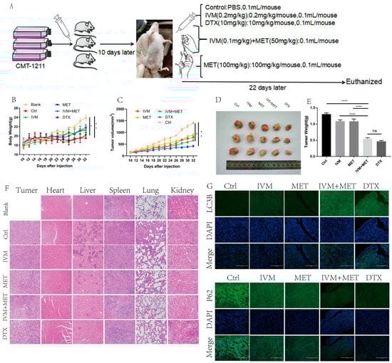 IVM combined with MET can inhibit the growth of canine breast tumor xenografts in vivo. (A) Establishing a mouse tumor model and a schematic diagram of the treatment plan. (B) Changes in the body weight of mice in each group during treatment. (C) Changes in tumor volume of mice in each group during treatment. (D,E) After euthanizing the mice, the tumors of the mice were collected and weighed. (F) H&E staining of mouse tumor tissues and organs (heart, liver, spleen, lung, kidney). (G) Immunofluorescence staining of LC3B and P62 in tumors. Scale: 200 µM. * p < 0.05; ** p < 0.001; **** p < 0.00001; ns = not significant.