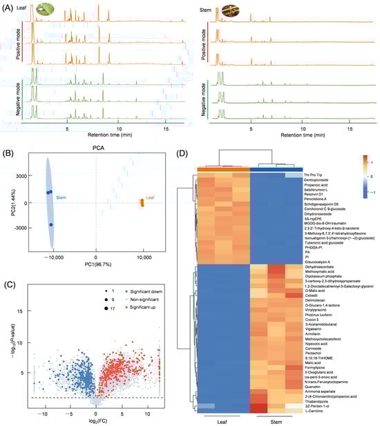 Quality assessment of DEMs in the leaf and stem of Isodon suzhouensis. (A) Total ion chromatogram (TIC) of leaf and stem samples in both positive and negative EI modes. (B) Principal component analysis (PCA) of leaf and stem samples. (C) Volcano plot of DEMs in leaf and stem. (D) Heat map of the top enriched DEMs.