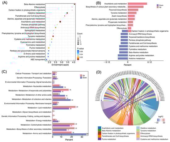 Enrichment analysis of DEMs in leaf and stem of Isodon suzhouensis. (A) The top enriched KEGG pathway of DEMs. (B) The enriched KEGG pathways of up- and down-regulated DEMs. (C) The KEGG pathway classification of the annotated DEMs. (D) The chord of significantly enriched DEMs.