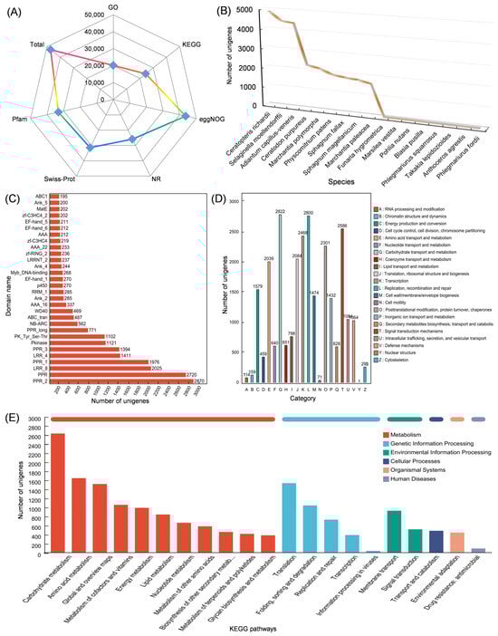 Annotation of unigenes of Isodon suzhouensis. (A) Functional annotation of the unigenes in the EggNOG, NR, Pfam, Swissprot, KEGG, and GO databases. (B) Species distribution of the unigenes. (C) The top 30 domains contained within the unigenes. (D) EggNOG annotation of the unigenes. (E) Kyoto Encyclopedia of Genes and Genomes (KEGG) categories of the unigenes.