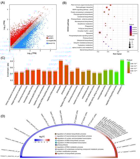 Analysis of DEGs in the leaf and stem of Isodon suzhouensis. (A) Scatter plot of DEGs. (B) KEGG enrichment of DEGs. (C) GO enrichment of DEGs. (D) Chord diagram of enriched DEGs. *** p-adjust < 0.001.