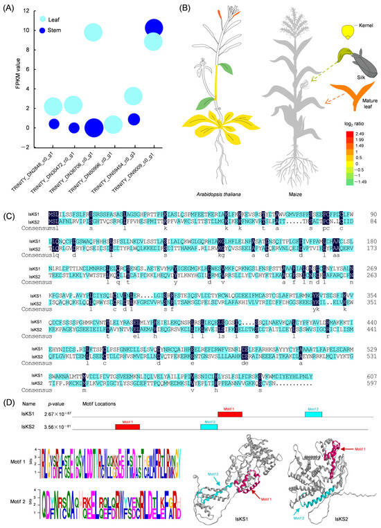 Identification of two IsKS from Isodon suzhouensis. (A) The relative expression level of KS genes in the leaf and stem of Isodon suzhouensis. (B) The expression level of the KS gene in Arabidopsis thaliana and maize. (C) Alignment of the amino acid sequences of IsKS1 and IsKS2. (D) Identification of two conserved motifs of IsKS1 and IsKS2.