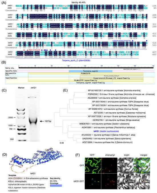 IaKS1, which had a higher expression level in the leaf than in the stem, was cloned from Isodon suzhouensis. Further bioinformatic analysis was conducted, revealing that IsKS1 has a gene length of 1827 bp and encodes an amino acid sequence of 608 aa. A comparison of the amino acid sequence and domain of AtKS1 (gene ID AT1G79460.1) with IsKS1 showed that IsKS1 contains the domains PLN02279 (accession PLN02279), terpene_cyclase_plant_C1 (accession cd00684), and terpene_synth_C (pfam03936). The presence of substrate binding pocket sites and Mg2+ binding sites suggests potential enzymatic activity of IsKS1 (Figure 6A–C). The physicochemical properties of IsKS1 were analyzed using online informatics analysis tools, revealing a formula of C3088H4771N813O921S31 and a molecular weight of 69015.61 Da. The theoretical isoelectric point (PI) of IsKS1 was predicted to be 5.52. The grand average of hydropathicity (GRAVY) of IsKS1 was −0.191, indicating that IsKS1 is a hydrophilic protein. The instability index of IsKS1 was calculated to be 55.61, suggesting that the protein is unstable. Secondary structure prediction showed that IsKS1 is composed of 65.13% alpha helix, 2.63% extended strand, 2.30% beta-turn, and 29.93% random coil (Supplementary Materials Figures S1 and S2). The tertiary structure revealed that IsKS1 shares 93.15% similarity with the ent-atiserene synthase KSL4 (accession number A0A1Z3GBK8.1.A) from Isodon rubescens (Rabdosia rubescens), indicating potential similar biological activity (Figure 6D). Phylogenetic analysis showed that IsKS1 has a closer evolutionary relationship with KS from Isodon rubescens and Plectranthus barbatus (Figure 6E). To determine the subcellular localization of IsKS1 and for further genetic transformation in Arabidopsis thaliana, we constructed the fusion plasmid pBWA(V)BS-KS-GFP-GUS and used it for the transient transformation of tobacco leaves (Supplementary Materials Figure S3). The fluorescence signal was observed using a laser confocal microscope, with green fluorescence mainly observed in the chloroplasts of tobacco leaves transformed with KS-GFP-GUS, consistent with the natural fluorescence of chloroplasts. The subcellular localization results confirmed that IsKS1 is located in the chloroplasts, as predicted by PlantPloc (Figure 6F).