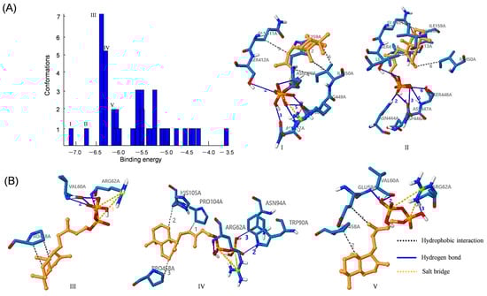 Docking analysis of IsKS1 with ent-CPP. (A) The predicted binding energy of ent-CPP to the IsKS1 protein. (B) The top five lowest-energy binding modes of ent-CPP to IsKS1. I–V, represent the five binding modes between substrates ent-CPP and IsKS1.