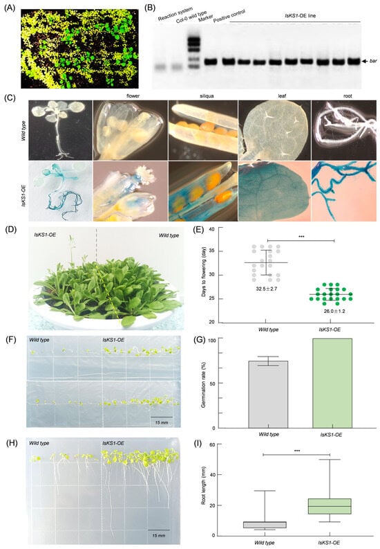 The IsKS1 gene was overexpressed in Arabidopsis thaliana using the floral dip method. Successful transformants were identified by spraying them with herbicide (glufosinate ammonium). The transgenic IsKS1 lines showed robust growth due to the presence of the bar gene, which confers resistance to the herbicide (Figure 8A). This was subsequently confirmed using a PCR method based on the bar gene. All successful transformants showed a band on agarose gel electrophoresis analysis, while the wild-type lines did not (Figure 8B). Further analysis of IsKS1 gene expression in different tissues using GUS staining revealed the presence of blue staining in all Arabidopsis tissues, indicating that IsKS1 has no tissue-specific expression (Figure 8C). Previous research has shown that the KS gene is involved in the biosynthesis of gibberellin, a plant hormone that promotes plant growth. To verify whether the IsKS1 gene has the same effect, we observed the growth status of transgenic Arabidopsis thaliana and found that the wild-type took longer to flower (32 days), whereas the IsKS1-overexpressing lines reached flowering in only 26 days. Additionally, the transgenic lines had a 100% germination rate and longer root length (21.2 mm) compared to the wild-type (9.9 mm), suggesting that the IsKS1 gene promotes growth and early flowering in Arabidopsis thaliana. These findings can be attributed to the understood role of the IsKS1 gene in gibberellin synthesis. Further metabolite identification is required to fully understand this relationship (Figure 8D–I).