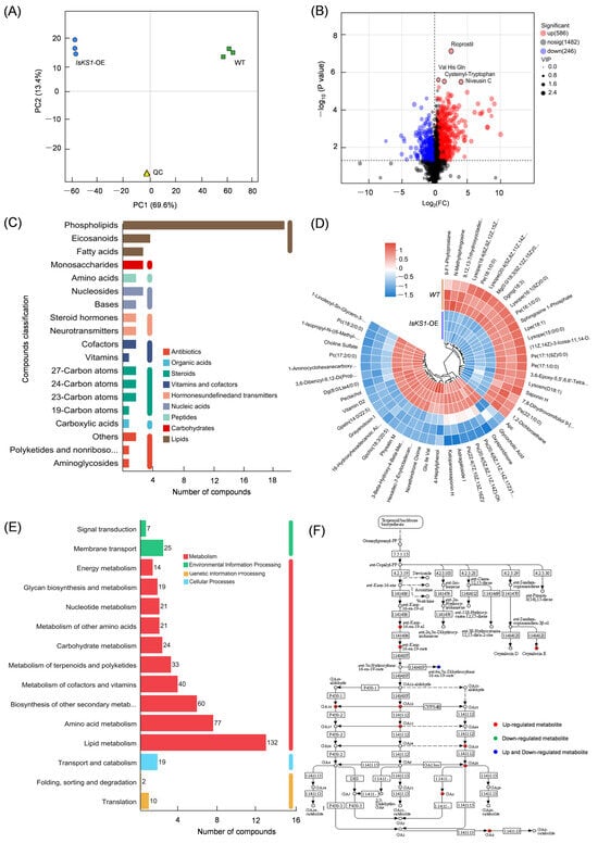 Metabolomic analysis of IsKS1-overexpressing Arabidopsis thaliana. (A) Principal component analysis (PCA) of wild-type and IsKS1-overexpressing Arabidopsis thaliana. (B) Volcano plot of DEMs in the IsKS1-overexpressing lines versus wild-type lines. (C) Types of DEMs. (D) Cluster tree diagram of the top up- and down-regulated DEMs. (E) The annotated KEGG pathway of DEMs. (F) Expression levels of DEMs annotated in the diterpenoid biosynthesis pathway.