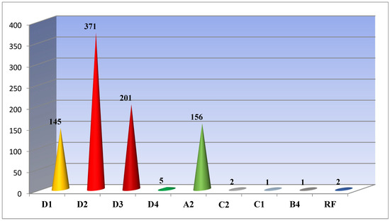 Our studies showed the following: 722 (81.7%) out of all 884 sequenced and analyzed samples had genotype D; 156 (17.7%)—Genotype A; 3 (0.3%)—Genotype C; and only 1 (0.1%)—Genotype B. For two cases (0.2%), a recombinant form of the hepatitis B virus was detected. Genotype D was found to be represented by subgenotypes D1 (145/20.1%, ±3.26), D2 (371/51.4%, ±5.3), D3 (201/27, 8%, ±3.5), and D4 (5/0.7%, ±0.3); A-A2 (156/17.7%, ±2.9); C1-1 (0.11%) and C2-2 (0.23%); B-B4 (0.11%); and recombinant forms C2/D (0.11%) and A2/C2 (0.11%) were detected (Figure 1).