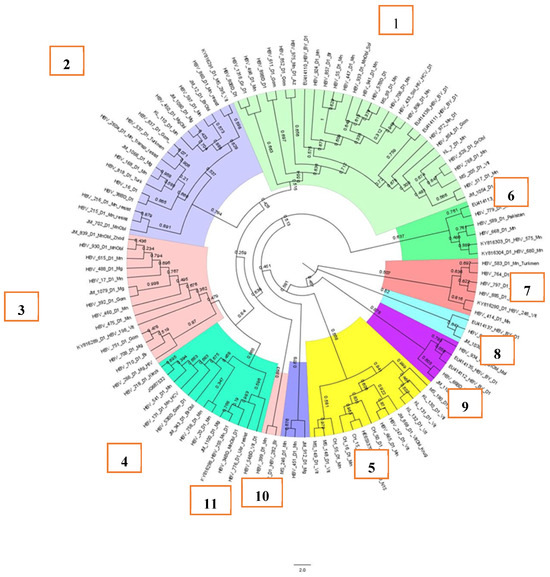 Eleven clusters were identified while analyzing samples of subgenotype D1, Figure 2. Five large clusters (1–5) containing 14 or more HBV DNA sequences, as well as small clusters 9–11, contained samples of HBV detected in citizens permanently residing in Belarus. Clusters 2, 4, and 6–8 contained HBV DNA sequences detected in patients from Ukraine (cluster 4), Pakistan (cluster 6), Turkmenistan and Afghanistan (clusters 2 and 7), and Azerbaijan (cluster 8).