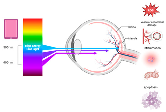 Blue light exposure can damage the eyes through several pathways, including oxidative stress, DNA damage, inflammation, mitochondrial dysfunction, apoptosis, impaired autophagy, and vascular endothelial damage (Figure 1) [36]. On the ocular surface, blue light can penetrate the eye and impact the corneal epithelial and endothelial cells, reducing their survival and increasing reactive oxygen species (ROS) and inflammatory markers like IL-1β [10]. The aging crystalline lens gradually absorbs more blue light, which can trigger ROS production in the lens epithelial cells, leading to apoptosis through the TGF-β/Smad3 pathway and contributing to cataract formation [6]. Damaged cells also release inflammatory signals, attracting immune cells and worsening tissue injury [9]. The retina is particularly vulnerable to oxidative stress due to its high metabolic activity and constant exposure to light and oxygen. Blue light can damage the retina primarily by inducing oxidative stress, especially in the retinal pigment epithelium (RPE) and photoreceptor cells. This damage is linked to the accumulation of lipofuscin, particularly its toxic component N-retinylidene-N-retinylethanolamin (A2E), which generates ROS under blue light [37,38]. These ROS are damaging because they react with cellular components like lipids, proteins, and the DNA. The retina contains large amounts of polyunsaturated fatty acids, particularly docosahexaenoic acid, which are especially prone to oxidation [33]. ROS cause endoplasmic reticulum stress, mitochondrial dysfunction, and lysosomal damage through the activation of pathways like MAPK and NF-κB [39,40], all contributing to RPE cell apoptosis. Blue light also disrupts calcium balance, further harming the mitochondria. Additionally, it elevates HIF-1α and VEGF expression, leading to retinal vascular endothelial dysfunction and potential neovascularization [41,42]. Prolonged exposure to low-intensity blue light can disrupt the retinal photoreceptors, while high-intensity blue light causes more severe damage. It inhibits cytochrome oxidase, disrupts mitochondrial function, reduces sodium–potassium ATPase activity, and leads to cell edema and photoreceptor degeneration [43]. Blue light also stimulates inflammatory signaling pathways, most notably NF-κB, a transcription factor that regulates genes involved in the immune response. The activation of NF-κB leads to the production of pro-inflammatory cytokines such as IL-6, TNF-α, and IL-1β. These cytokines create a chronic inflammatory environment that contributes to structural damage in the retina over time [44]. Rod and cone cells are particularly vulnerable due to rhodopsin and S-opsin, which enhance photon capture and increase light-induced damage. Short-wavelength LEDs exacerbate this by aggregating visual proteins and damaging the cone cells [45]. Moreover, blue light can compromise the blood–retinal barrier by damaging RPE tight junctions, allowing the infiltration of inflammatory cells into the retinal tissues. This perpetuates oxidative injury and accelerates retinal degeneration [46].