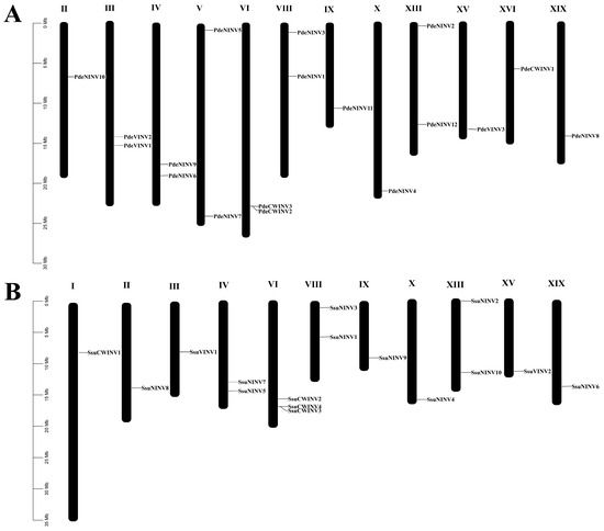 Chromosome maps of INV genes in the genomes of P. deltoides and S. suchowensis. (A) Eighteen PdeINV genes were mapped to 12 chromosomes in P. deltoides. (B) Sixteen SsuINV genes were mapped to 11 chromosomes in S. suchowensis. Genes showing tandem duplications are highlighted with red borders.