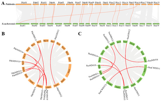 Collinearity analysis of INV genes. (A) Homologous relationships between P. deltoides and S. suchowensis on chromosomes. (B) Intraspecific collinear segments in P. deltoides. (C) Intraspecific collinear segments in S. suchowensis. Red lines indicate collinear INV gene pairs, and light-gray lines represent collinear segments.