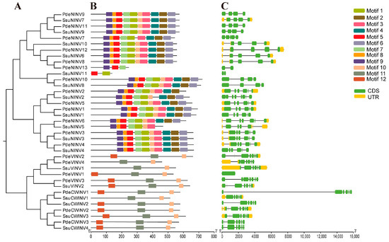 Phylogenetic relationships, conserved motifs, and gene structures of INVs in P. deltoides and S. suchowensis. (A) A phylogenetic tree constructed with 1000 replicates using the maximum-likelihood method in MEGA 5.1. (B) Conserved motifs in INV proteins. Individual motifs are represented by colored boxes, with solid black lines representing non-conserved sequences. The size and position of the motifs are shown according to the scale at the bottom of the figure. (C) Exon–intron structures of INV genes. Exons are represented in green, and introns are shown as solid black lines. The relative positions of introns and exons are shown according to the scale provided at the bottom of the figure.