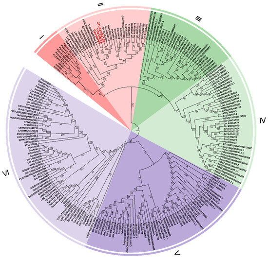 Phylogenetic relationships of INVs in 11 plant species. The neighbor-joining tree was constructed in MEGA 5.1 with 1000 bootstrap replicates. All INVs were clustered into six different groups (I–Ⅵ), represented by different colors. Groups Ⅰ and Ⅱ in the red area represent VINVs, Groups Ⅲ and Ⅳ in the green area are CWINVs, and Groups Ⅴ and Ⅵ in the purple area are NINVs. The 11 plant species are Physcomitrella patens, Selaginella moellendorffii, Oryza sativa, Zea mays, Populus deltoides, Salix suchowensis, Gossypium hirsutum, Arabidopsis thaliana, Solanum lycopersicum, Oryza sativa, and Solanum tuberosum.