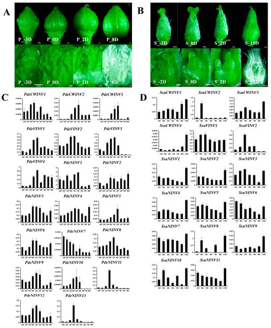 Expression of INV genes in P. deltoides and S. suchowensis during seed fiber initiation and development. (A) Phenotypes of seed hairs and the development of internal seed fibers in P. deltoides at different stages. (B) Phenotypes of seed hairs and the development of internal seed fibers in S. suchowensis at different stages. Scale bar = 1 mm in both (A,B). (C) Expression of INV genes in P. deltoides. (D) Expression of INV genes in S. suchowensis. The x-axis represents different periods and the y-axis represents relative expression levels. The values shown are the mean ± standard deviation of three biological replicates (p < 0.01, two-tailed Student’s t-test).