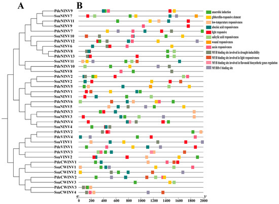 Homologous relationships between the two species were analyzed, identifying 13 pairs of homologous genes (Supplementary Table S2). Eleven pairs of INV genes were located in the same chromosomal positions in the two species, while two pairs were in different positions. Among them, the linear relationship of one pair of genes could not be determined as they had not yet been mapped to chromosomes (Figure 2A). The other pair of homologous genes, PdeCWINV1 and SsuCWINV1, were located on chromosome 16 of Populus deltoides and chromosome 1 of Salix suchowensis, respectively. This may be because poplars and willows originally shared a common ancestor. During evolution, they experienced a key salicinoid genome duplication event, which ultimately led to the differentiation into two major branches representing the current Populus and Salix genera [49]. Two main chromosomal rearrangements occurred during this process, with chromosome 1 of willow being a combination of poplar chromosome 16 and the lower part of chromosome 1, while willow chromosome 16 corresponds to the upper part of poplar chromosome 1 [46]. The results suggest that despite significant differences in distribution on some chromosomes, the overall distribution of INV genes was similar in the two genomes.