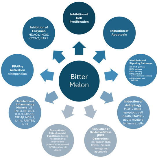 - Psilopatis , I.; Vrettou, K.; Giaginis , C.; Theocharis, S. The Role of Bitter Melon in Breast and Gynecological Cancer Prevention and Therapy. Int. J. Mol. Sci. 2023, 24, 8918. [Google Scholar] [CrossRef]
