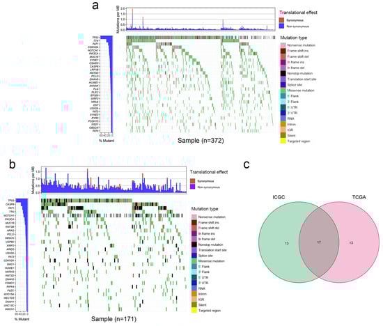 The mutation data of patients with OSCC were downloaded from TCGA and the ICGC database. The top 30 frequently mutated genes with their corresponding mutation profiles in TCGA and the ICGC database were identified (Figure 1a,b). In addition, 17 frequently mutated genes were identified by generating a Venn diagram indicating the intersection of the top 30 most frequently mutated genes in the ICGC and TCGA cohorts, and these were TP53, CASP8, FAT1, TTN, NOTCH1, PIK3CA, MUC16, HRAS, PCLO, OBSCN, XIRP2, FAT3, CDKN2A, USH2A, HUWE1, KMT2D, and PLEC (Figure 1c). In the subsequent analyses, these 17 commonly mutated genes were the focus of the present study.