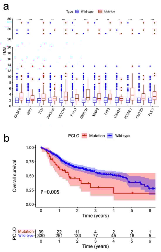 Association between TMB and mutant genes. (a) Mutations of 13 genes were associated with TMB. The Wilcoxon rank-sum test was used. * p < 0.05; ** p < 0.01; *** p < 0.001. (b) Association between gene mutations of PCLO and overall survival. Kaplan–Meier survival analysis of patients with oral squamous cell carcinoma revealed relationships between PCLO mutations and prognostic outcomes. The p-value is indicated in the plot. TMB, tumor mutational burden.