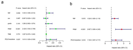 Patients with OSCC were classified into two groups according to the mutation status of the examined genes (wild-type and mutant group). Among the 17 mutated genes analyzed, four were not significantly related to the TMB and were therefore removed. Samples with mutations in the remaining 13 genes (CASP8, FAT1, TTN, PIK3CA, MUC16, PCLO, OBSCN, XIRP2, FAT3, USH2A, HUWE1, KMT2D, and PLEC) exhibited a significantly greater TMB than those in the wild-type group (Figure 2a). A higher TMB frequently indicates a favorable clinical prognosis for patients with OSCC [23]. Consequently, it was assessed whether these gene mutations associated with higher TMB also influenced the survival outcome of patients with OSCC by performing Kaplan–Meier analysis. FAT1 (p = 0.003), PCLO (p = 0.005), and KMT2D (p = 0.019) mutation was associated with OS, whereas the mutations in the other 10 genes appeared not to be significantly associated with OS (p > 0.05) (Figure S1). PCLO is relatively understudied in OSCC, and thus, it was explored further. As shown in Figure 2b, patients with OSCC with PCLO mutations had a worse OS than noncarriers. Thus, PCLO could be a novel biomarker for evaluating the survival prognosis of patients with OSCC. The results of the univariate regression analysis indicated that several clinicopathological factors, including age [hazard ratio (HR), 1.444; 95% CI, 1.036–2.012; p = 0.030], stage (HR, 2.420; 95% CI, 1.542–3.798; p < 0.001), and PCLO mutation status (HR, 1.613; 95% CI, 1.029–2.526; p = 0.037), were significantly associated with OS (Figure 3a). As shown in Figure 3b, PCLO mutation remained a significant prognostic factor after taking age and stage into account; thus, PCLO mutation was regarded to be an independent prognostic factor for OS in patients with OSCC. Age and stage were also significant prognostic factors.