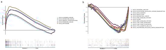 Gene set enrichment analysis. (a) Multiple gene enrichment plot showing that a series of gene sets were enriched in the PCLO-mutant group. (b) Multiple gene enrichment plot showing that a series of gene sets were enriched in the PCLO wild-type group. KEGG, Kyoto Encyclopedia of Genes and Genomes.