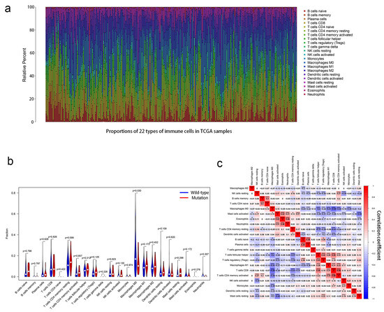 The ‘CIBERSORT’ package (v1.03) of R software (https://cibersortx.stanford.edu/ (accessed on 21 September 2022)) was used to calculate the fractions of each immune cell in each OSCC sample with gene expression data, and p < 0.05 was regarded as the cutoff criterion [20]. A correlation heatmap was used to analyze the correlation of each type of immune cell with the other types in OSCC samples using the ‘corrplot’ package (v0.92; https://cran.r-project.org/web/packages/corrplot/index.html (accessed on 21 September 2022)). The R package ‘vioplot’ (v0.5.0; https://cran.r-project.org/web/packages/vioplot/index.html (accessed on 21 September 2022)) was used to visualize the differences in the infiltration of 22 immune cell types between PCLO-mutated and PCLO-wild-type samples. p < 0.05 was employed as the standard to identify the immune cell populations possibly influenced by the mutation levels of PCLO.