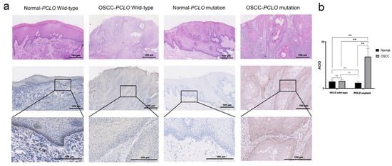 Using OSCC tissues from the Peking University School and Hospital of Stomatology (Beijing, China), PCLO expression was detected using IHC, and the corresponding H&E images are shown in Figure 6a. PCLO expression was considerably higher in OSCC tissues with PCLO mutations than in corresponding normal epithelium tissues and OSCC tissues without PCLO mutations (p < 0.01; Figure 6b). Additionally, in patients with OSCC with PCLO mutations, the piccolo protein was mainly distributed in the basal layer of the epithelium (Figure 6b).