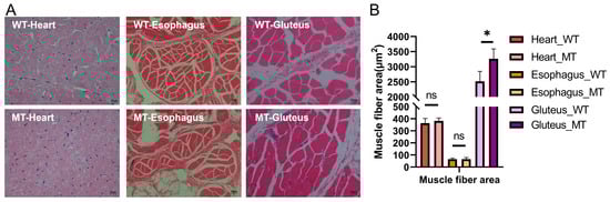 Histological morphology and muscle fiber area analysis of heart muscle, esophageal muscle, and gluteus muscle in MT and WT cattle. (A) Representative HE-stained sections showing tissue morphology of the three muscle types. (B) Quantification of muscle fiber area for each muscle type. p < 0.05 was considered statistically significant. * p < 0.05; ns, not significant.