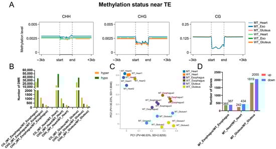 The cytosine coverage statistics show that the majority of cytosines in all tissues and groups (MT and WT) had relatively low sequencing depth (0–10×), with over 75% of sites falling into this range, while only a small proportion of sites had high coverage (>30×), indicating an overall moderate sequencing depth across samples (Supplementary Table S3). The methylation landscape of CG, CHG, and CHH contexts exhibited distinct distribution patterns across the three muscle types (heart, esophagus, and gluteus). CG methylation showed the highest levels (98.06–99.00%, Supplementary Table S4) among the three contexts, with a sharp decrease near the transcription start site (TSS), whereas CHG and CHH methylation levels remained relatively low and stable across genomic regions (Figure 3A).