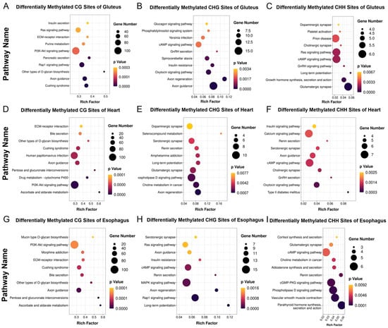KEGG enrichment analysis of differentially methylated CH, CHG, and CHH sites between MT and WT cattle. (A–C) KEGG pathway enrichment of differentially methylated cytosines (mCH, mCHG, and mCHH) in skeletal muscle. (D–F) KEGG pathway enrichment of mCH, mCHG, and mCHH in heart muscle. (G–I) KEGG pathway enrichment of mCH, mCHG, and mCHH in smooth muscle.