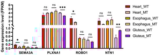 Expression levels of axon guidance-related genes in three muscle types of WT and MT cattle. FPKM values of SEMA3A, PLXNA1, ROBO1, and NTN1 were compared between WT and MT cattle in heart, esophageal, and gluteus muscles. Data are presented as mean ± SD (n = 3 per group). * p < 0.05, ** p < 0.01, and *** p < 0.001; ns, not significant.