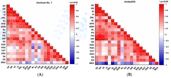 | Cultivar | Treatment | Seedling Root Length (SRL, cm) | Seedling Length (SL, cm) | Seedling Fresh Weight (SFW, mg) | Seedling Dry Weight (SDW, mg) |