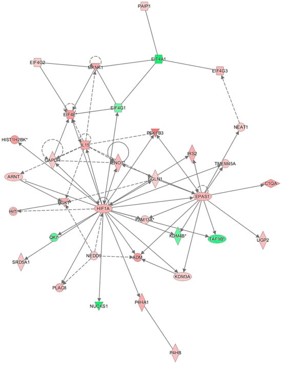 HIF-centered network in sepsis via ingenuity pathway analysis. Solid line means direct regulation and dot line means indirect regulation. * means this gene has high fold change value.
