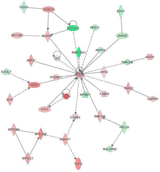 PTEN-centered network for sepsis via ingenuity pathway analysis. Solid line means direct regulation and dot line means indirect regulation. * means this gene has high fold change value.