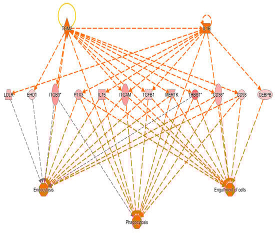 IL1B-, TGFB-, and TGM2-dominant regulatory pathways in sepsis via ingenuity pathway analysis. Arrow means up-regulation, yellow circle means auto-suppression, and * means high fold change value.