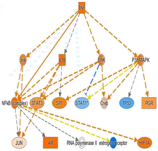 TNF is the key upstream mediator during sepsis, as identified via ingenuity pathway analysis. Orange dotted line means activation, blue dotted line means inhibition, yellow dotted line means inconsistent with expression, and grey line means unclassified interaction. * sign means high value in fold change.