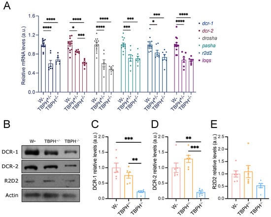 Regulatory role of TBPH in genes associated with miRNA biogenesis. (A) RT-qPCR analysis of the mRNA levels of dcr-1, dcr-2, drosha, pasha, r2d2, and loqs in TBPH deficiency flies. Expression of rp49 mRNA was used as endogenous control; (B–E) Western blot analyses of the effect of DCR-1 (C), DCR-2 (D), and R2D2 (E) in TBPH+/− and TBPH−/− flies and the relative protein expression were quantified (n = 6 flies for each genotype). Data were analyzed using one-way ANOVA with Tukey’s post hoc test. (* p < 0.05, ** p < 0.01, *** p < 0.001, **** p < 0.0001). Error bars represent mean ± SEM.