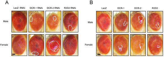 Effect of miRNA biogenesis-related genes on fly compound eye damage. (A) The GMR-GAL4 driver was used to express UAS-DCR-1 RNAi, UAS-DCR-2 RNAi, and UAS-R2D2 RNAi in the compound eyes of flies. Representative images illustrating compound eye damage are presented, with the upper panel showing male fly compound eyes and the lower panel showing female fly compound eyes. All images were cropped to uniform dimensions, and areas of compound eye damage are indicated by white dashed lines. (B) GMR-GAL4 was used to drive the expression of UAS-DCR-1, UAS-DCR-2, and UAS-R2D2 in the compound eyes of flies. Representative images of eye damage are shown, with the upper panel displaying male flies and the lower panel displaying female flies. All images were cropped to the same dimensions, and the damaged eye regions are indicated by white dashed lines. Scale bar: 50 μm.