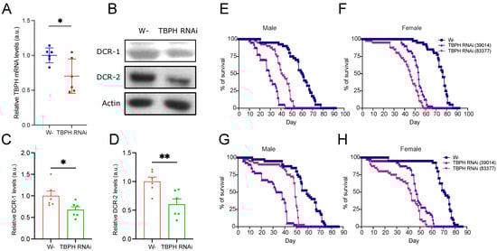 TBPH RNAi reduces DCR expression and shortens lifespan. (A) qPCR analysis of TBPH mRNA levels in the thorax of wild-type and whole-body TBPH knockdown flies (n = 6); (B) representative Western blot images showing DCR-1 and DCR-2 protein expression levels following TBPH knockdown, with actin as the loading control; (C,D) quantification of DCR-1 (C) and DCR-2 (D) protein expression levels from (B) (n = 6); (E,F) lifespan analysis of male (E) or female (F) flies with pan-neuronal (elav-GAL4>) TBPH knockdown; (G,H) lifespan analysis of male (G) and female (H) flies with motor neuron-specific (D42-GAL4>) TBPH knockdown. Data are shown as mean ± SEM and were analyzed using a two-tailed t-test. * p < 0.05, ** p < 0.01.