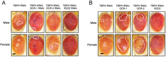 In our results, sex exerts a notable influence on both compound eye phenotype and lifespan in flies. These are modulated by TBPH, which regulates genes related to miRNA biogenesis, particularly DCR proteins. In experiments using the GMR-GAL4 driver, the overexpression or knockdown of DCR-1, DCR-2, and R2D2 in the compound eyes resulted in observable rough eye phenotypes, with effects consistent across males and females. However, the severity of these phenotypes, when caused by TBPH RNAi combined with Dicer-manipulated expression, is more severe in females, a finding consistent with our previous observation []. This aligns with TBPH RNAi exacerbating eye damage when combined with DCR-1 and DCR-2 overexpression, indicating a functional interplay between TBPH and DCR proteins. This may be sex-dependent, suggesting sex-specific differences in sensitivity or different compensatory mechanisms.