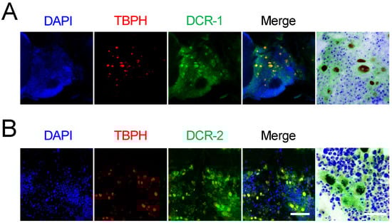 To further explore the observed relationship between TBPH and DCR, we expressed TBPH tagged with red fluorescent protein (RFP) in adult motor neurons while labeling DCR proteins with anti-DCR antibodies (green fluorescence). Confocal microscopy analysis of fly brains revealed that both DCR-1 (Figure 5A) and DCR-2 (Figure 5B) co-localized with TBPH at the subcellular level, suggesting potential direct interaction.