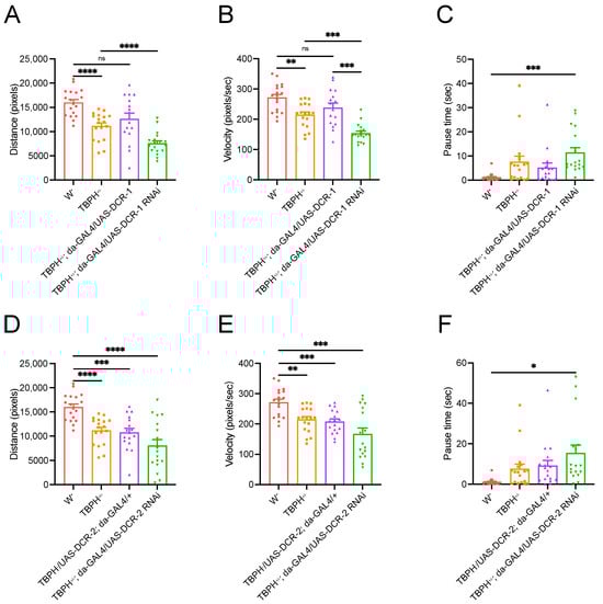 We have established that TBPH knockdown significantly reduces lifespan in Drosophila, producing a pathological phenotype reminiscent of ALS. Also, we have observed a substantial regulatory effect of TBPH on DCR protein expression. However, it remains unclear whether the TBPH regulation of DCR proteins is associated with motor impairment in flies. To address this, we conducted locomotor analysis on heterozygous adult flies of TBPH KO, as the homozygotes are lethal []. Compared to wild-type flies, flies with a TBPH+/− genetic background exhibited a significant reduction in both movement distance and speed, and also an increase in immobility time (Figure 6). However, the overexpression of DCR-1 in that background led to restored locomotor ability to wild-type levels (Figure 6A,B). In contrast, knocking down DCR-1 in the same background further reduced movement distance and speed while increasing immobility time (Figure 6A–C). Similarly, although DCR-2 overexpression did not significantly improve locomotor ability in TBPH+/− flies (Figure 6D–F), its knockdown markedly increased immobility time (Figure 6F). These findings collectively demonstrate that the knockdown of DCR genes exacerbates the motor defects induced by TBPH knockdown.